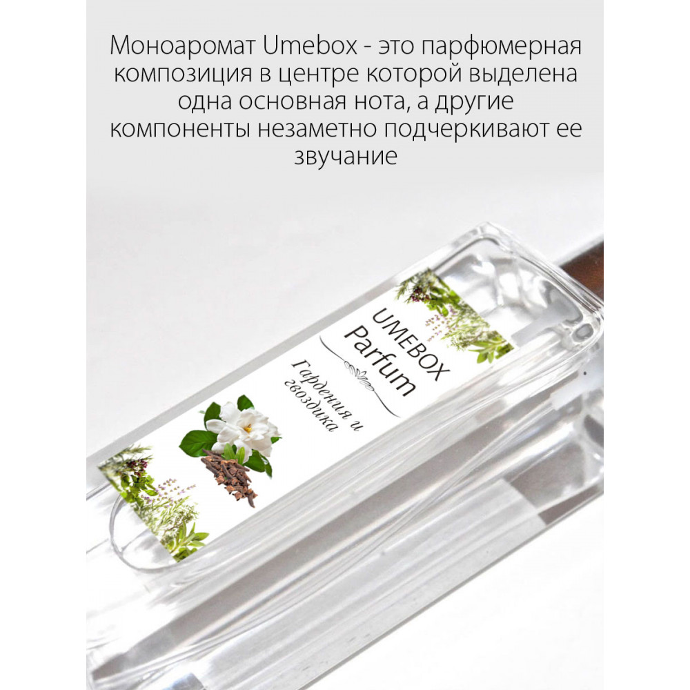Моноаромат Umebox - это парфюмерная композиция в центре которой выделена одна основная нота, а другие компоненты незаметно подчеркивают ее звучание. В моноаромате нет верхних, средних и базовых нот. Есть только одна нота, которая пахнет одинаково на протяжении всего времени звучания композиции. Такие духи можно сочетать между собой, создавая собственный, неповторимый парфюм. Гардения и Гвоздика не кричит, не давит. Гардения здесь не наглая, а мягкая, тонко-сладкая, приправленная изысканной (цветочно-специевой) гвоздикой. Эти две ноты плотно сплелись между собой, создав душисто-пряную композицию.