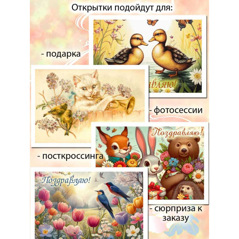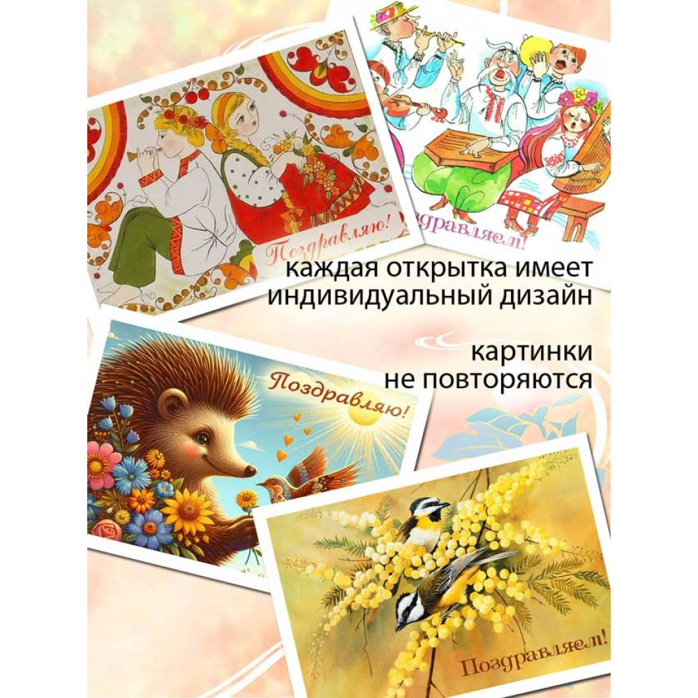 Размер открыток 7х10 см делает их идеальными для максимальной универсальности - вы сможете использовать их как карточки, присоединив свои теплые пожелания, так и в качестве декоративного элемента на праздничном столе или в комнате.