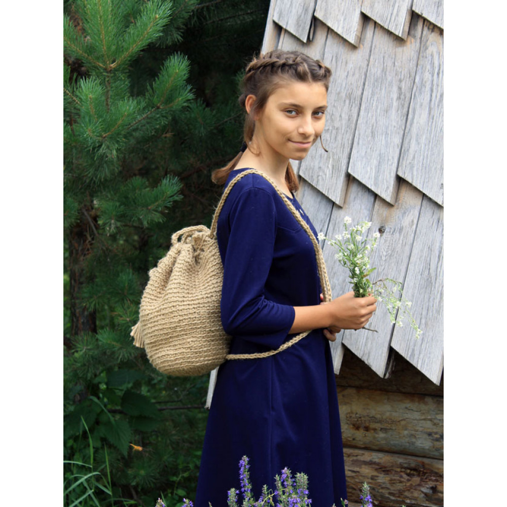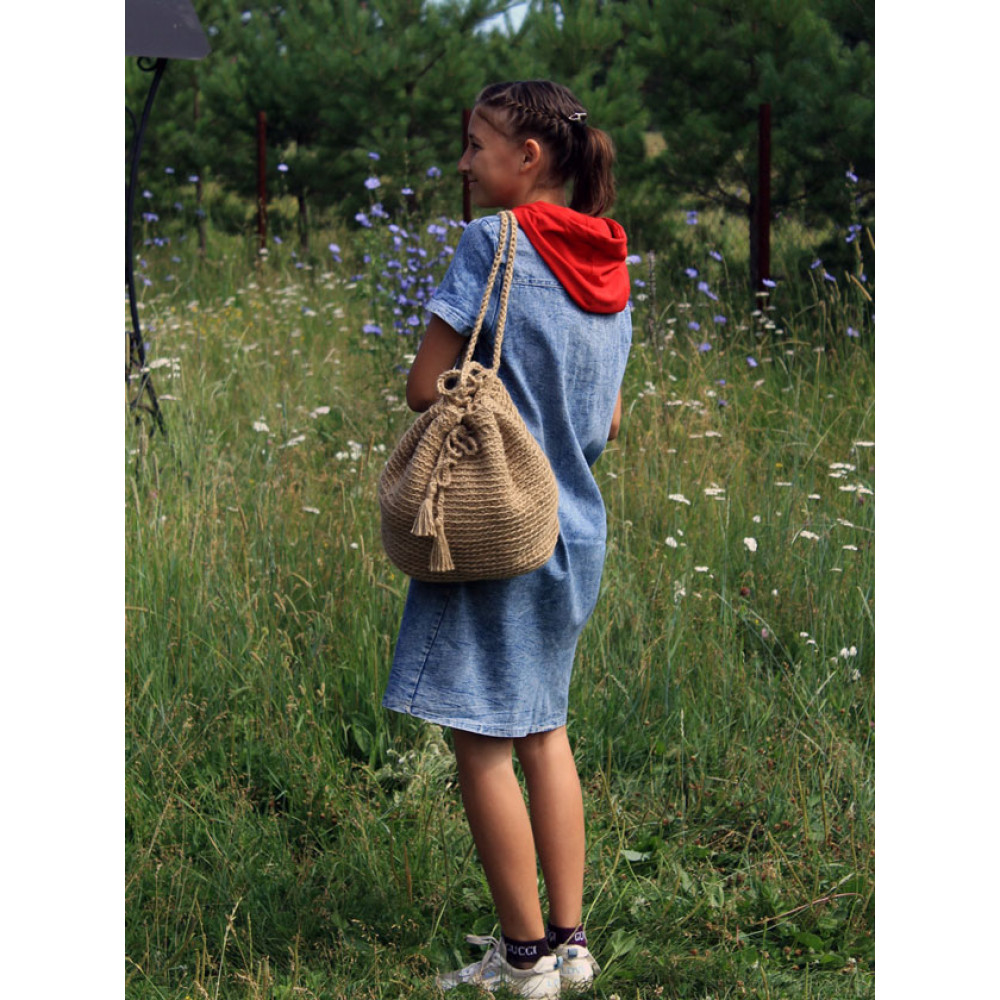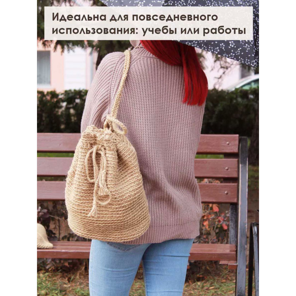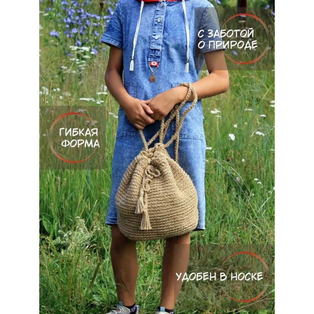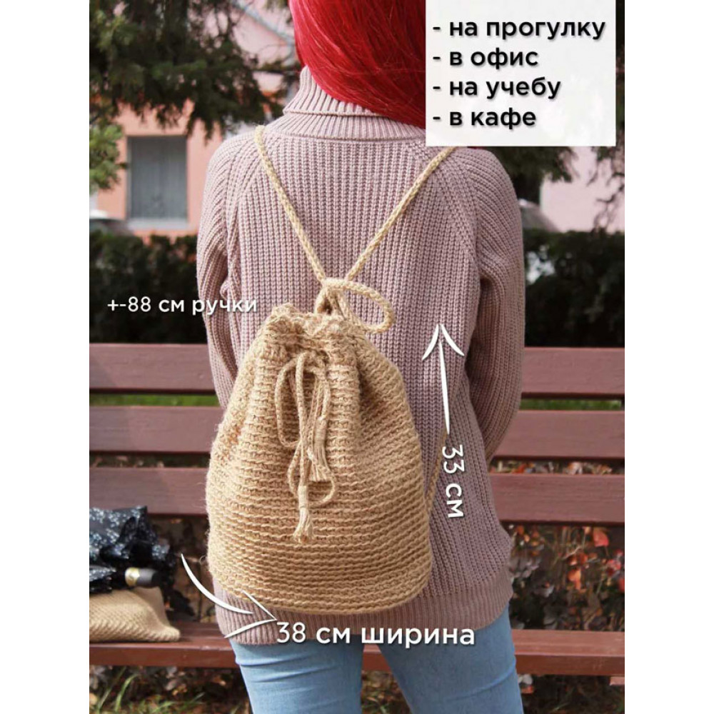 Женский рюкзак ручной работы, вязаная крючком из джута. Джут - это натуральный материал растительного происхождения. Рюкзак вместительный, объемный, подходит для похода за покупками и прогулки. Вмещает в себя очень много, экологичнее, чем пластиковый пакет. Изделие ручной работы, в размерах допустимы погрешности из-за специфики изготовления +- 1-2 см. Подойдет для в качестве подарка подруге, сестре, бабушке или маме, материал не требует сложного ухода, достаточно сухой чистки. Изделия из джута биоразлагаемы и после эксплуатации могут стать компостом для растений. Джут имеет специфических запах, который со временем выветривается. В начале эксплуатации изделие может немного колоться, из-за наличия ворсинок. Со временем они исчезают и изделие становится приятно в носке.